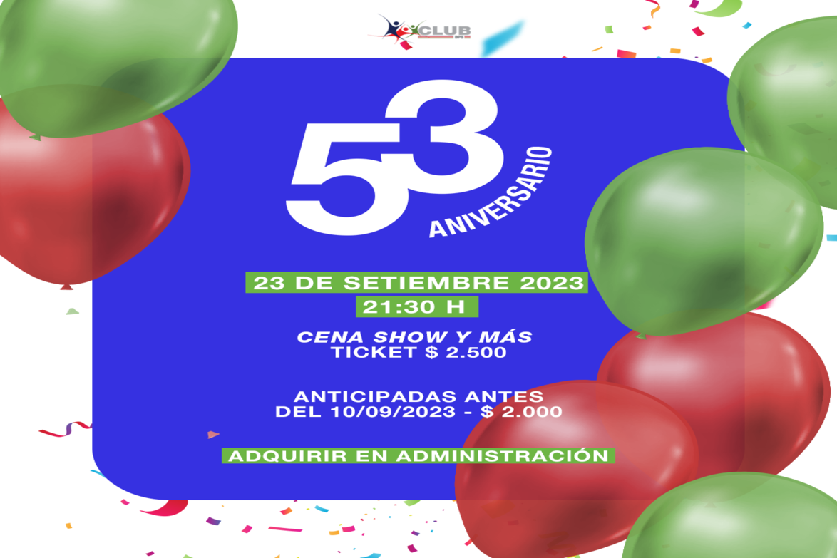 04 Septiembre 2023 53 Aniversario Un añito mas y seguimos contando ? Festejamos nuestro 53 aniversario con un evento espectacular ??? Aprovechá las entradas anticipadas a un costo menor, ⏳ por tiempo limitado. Próximamente más detalles…? Anterior Siguiente